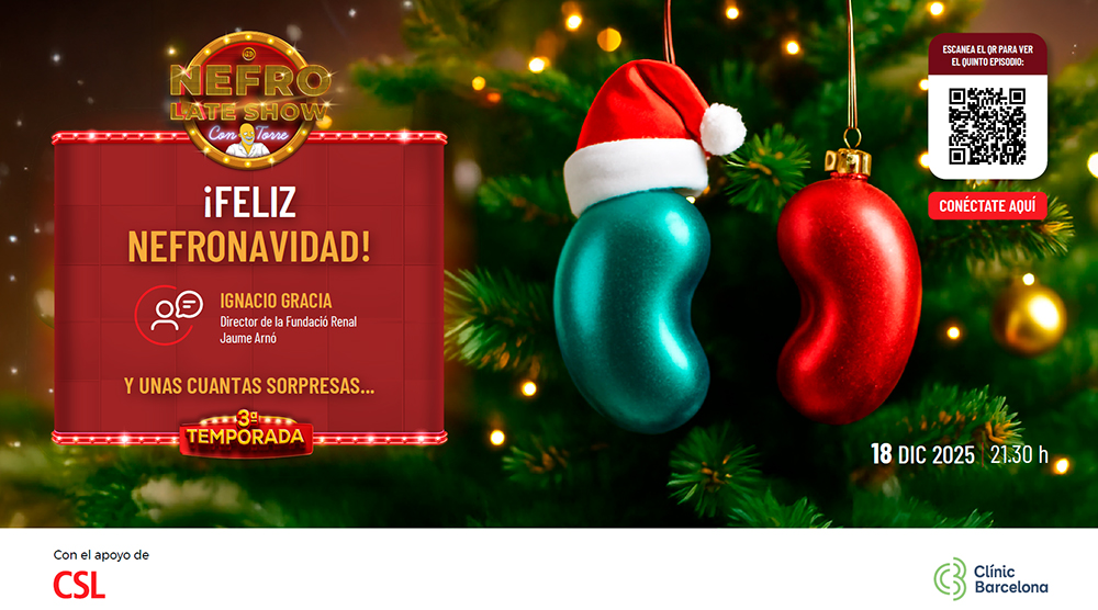 Hoy 18 de diciembre, a las 21:30 se emitirá en directo el sexto episodio de la tercera temporada de Nefrolateshow con Torre, titulado “Feliz Nefronavidad”, en un programa especial de Navidad y cierre de temporada. El espacio contará con la participación de Ignacio Gracia, persona renal de larga trayectoria y director de la Fundación Renal Jaume Arno de Lleida; de las doctoras Diana Rodríguez y Edoardo Melilli, quienes en la sección TORREnews presentarán los diez mejores artículos del año; además de la sección TORREspuestas, en la que, con la ayuda de Yolanda (Nefrowoman), se resolverán dudas navideñas, junto a numerosas sorpresas.