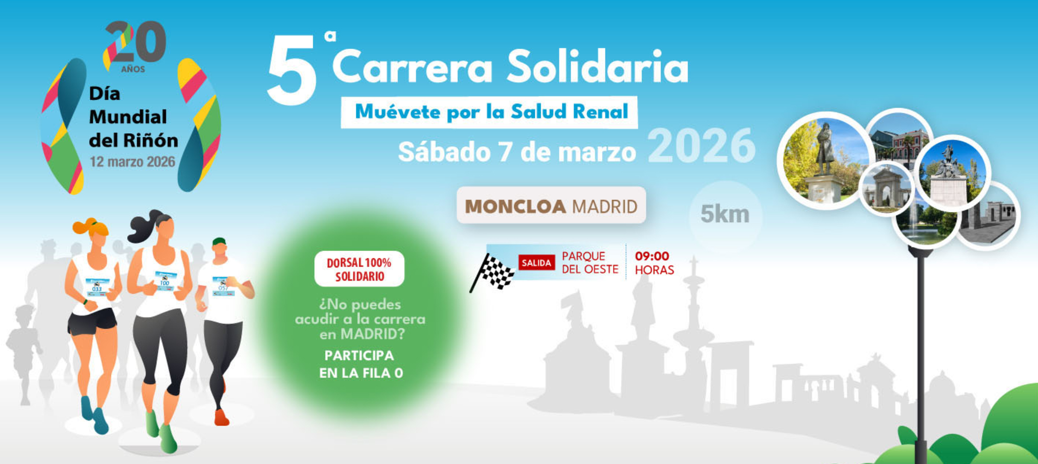 El próximo 7 de marzo de 2026, Madrid volverá a ponerse las zapatillas por una buena causa con la celebración de la 5ª Carrera “Muévete por la Salud Renal”, que tendrá lugar en el Parque del Oeste (Moncloa). La prueba, abierta a todos los niveles, contará con un recorrido de 5 kilómetros y dará comienzo a las 09:00 horas. Se trata de una cita deportiva y solidaria que combina ejercicio físico, concienciación y apoyo a la salud renal. La carrera se enmarca en la celebración del Día Mundial del Riñón, que este año conmemora su 20º aniversario, reforzando el mensaje de la importancia de la prevención y el cuidado de la salud renal a través de hábitos de vida saludables. Para aquellas personas que no puedan asistir de forma presencial, la organización ofrece la posibilidad de colaborar mediante el Dorsal 100 % Solidario – FILA 0, una opción que permite apoyar la causa aunque no se participe en la carrera.